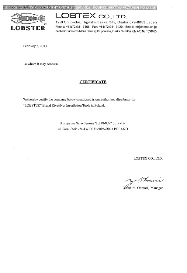 Więcej informacji w załączonych materiałach oraz na stronie producenta >>  LOBTEX. Firma HERMESTOOLS jest oficjalnym dystrybutorem produktów LOBSTER w Polsce >> autoryzacja.
