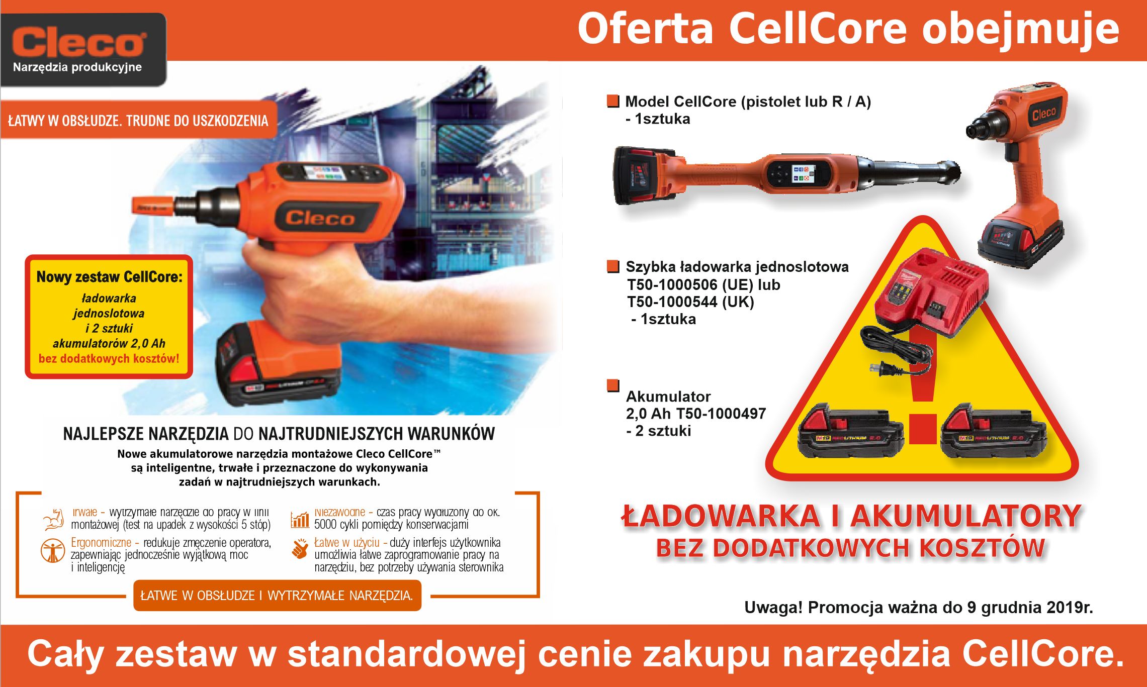Promocja na zestaw CellCore (12/11/2019) Promocja obejmuje zestaw: narzędzie (pistolet lub R/A)+ładowarka jednoslotowa+2 akumulatory po 2Ah każdy. Cały zestaw w standardowej cenie zakupu narzędzia CellCore. Promocja trwa do 9 grudnia 2019 r.