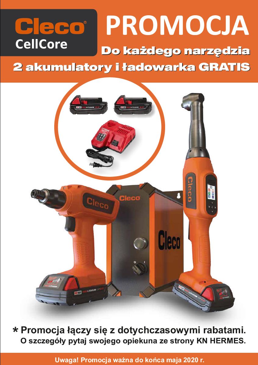 Informujemy o wprowadzeniu do naszej oferty nowych narzędzi akumulatorowych z przetwornikiem CLECO CellCore. Specjalnie na tą okazję przygotowaliśmy promocję - do każdej zakupionej wkrętarki dwa akumulatory i ładowarka GRATIS.