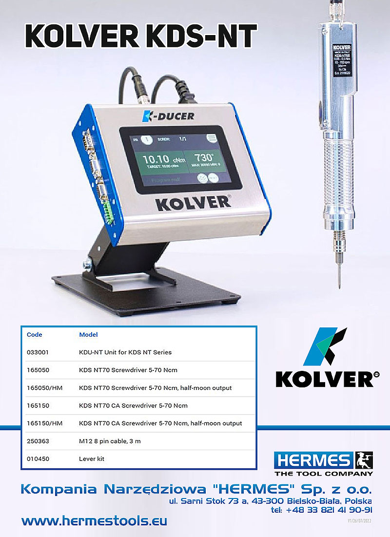 Wspólnie z firmą Kolver Srl oficjalnie prezentujemy nowy przetwornikowy wkrętak przeznaczony dla niskich momentów dokręcania. Zakres pracy narzędzia mieści się w przedziale 5-70cNm (0,05-0,50Nm), dzięki temu jest to jeden z najbardziej uniwersalnych wkrętaków na rynku w tym segmencie. Narzędzie współpracuje z nowym kompaktowym sterownikiem KDS-NT o funkcjonalności znanej dla serii standardowych narzędzi przetwornikowych Kolver Srl K-Ducer.